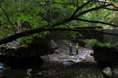 上浦幌地区から東へ川流布川の支流・茂川流布川沿いをしばらく進むと、持田さんが「ここです」と指をさした。町立博物館から約1時間かけて到着した山奥。川の左岸にひっそりと案内看板があった。
