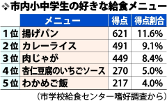 調査は9月に実施し、市内の小学校8校の5年生と中学校5校の2年生を対象に、895人から回答を得た(回答率87・8%)。人気メニューについては、全献立からベスト3を選んでもらい、得点化した。