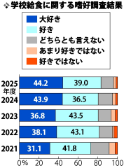 給食を「大好き」と答えた児童・生徒は44・2%、「好き」は39・0%を占め、「大好き」や2項目の合計は年々、上昇傾向にある。同センターは新メニューの増加、献立や調理方法の工夫を理由に挙げる。
