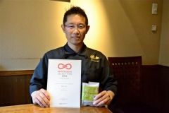 認定証を手に笑顔を見せる十勝スロウフードの藤田社長