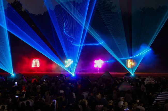 「ハナオト」の文字を浮かび上がらせた仕掛け花火。レーザーで幻想的な雰囲気を演出した(長尾悦郎通信員撮影)