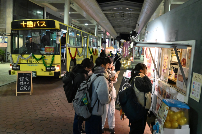 十勝バスの車両2台が休憩所として開放され、暖房が入った車内で食事する来場者も目立った。