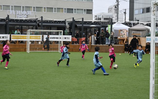 この日の「サッカーフェスティバル」は、藤丸パーク中地の人工芝を活用した。帯広北高男子サッカー部の片桐聡監督が、「百貨店とスポーツ」「高校生と地方創生」の結合を目的に、新藤丸に企画を打診し実現。同校サッカー部員らが運営などを担った。