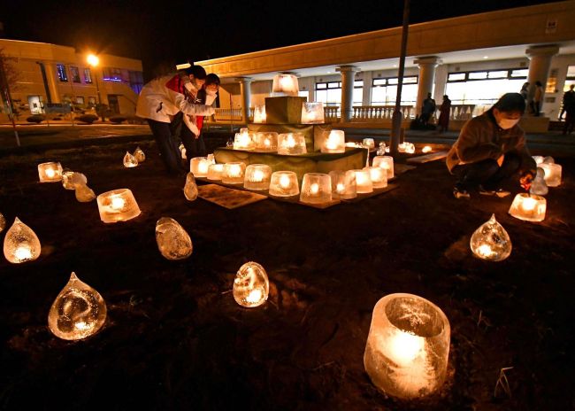 この日夜の点灯式には、柔道少年団や池田中サッカー部が参加。同校ソフトテニス部の佐藤舞羽さん(14)と桑原香凛さん(13)は「イブにアイスキャンドルを見るのは初めて。とてもきれい」と喜んでいた。