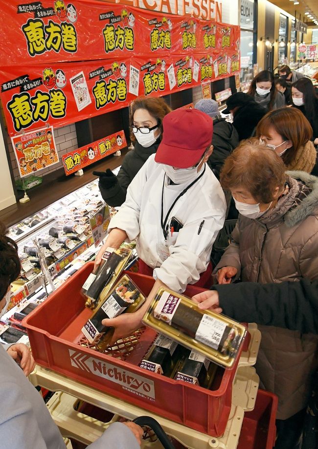節分の2日、十勝管内のスーパー、すし店では恵方巻きが並んだ。予約段階で売り上げを伸ばす店舗もあり、関係者からは「コロナ禍という世相もあり、厄払いとして買う人も多いのでは」との声も聞こえる。