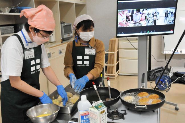 双方がオンラインで結ばれる中、講師を務めるJA十勝地区女性協議会(平かよ子会長)の4人は、とかちプラザで調理。台東区・たいとう栄養士会(5人)と、墨田区・食育goodネット(6人)のメンバーと一緒に、「じゃがいもピザ」と「カマンベールチーズコロッケ」を作った。