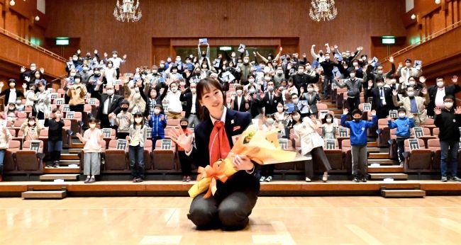 村民ら約100人が参加。村スケート少年団の子どもや「応援する会」の石澤健二会長が、花束と北京五輪での勇姿を映した特製パネルを贈呈した。