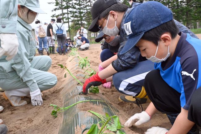 作業が開始すると子どもたちはサツマイモの苗とジャガイモの種芋を黙々と植えていった。同高の生徒は「もう少し苗を斜めにしてみて」「いいね、上手」などと声を掛けながら子どもたちをサポートした。