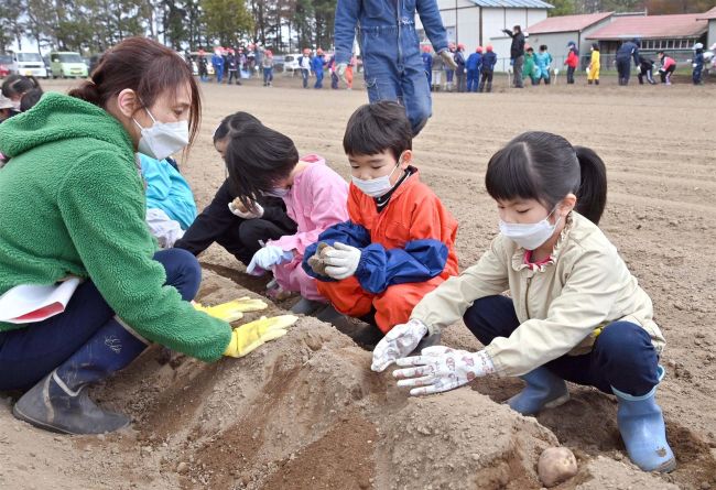 食育授業の一環で全校児童が参加。コロナ感染対策で2、4、6年生と1、3、5年生で作業時間をずらした。児童会長の中村騎士(ないと)さん(6年生)が「おいしいナガイモが作れるように心を込めて植えましょう」とあいさつ。児童は種イモの芽が上を向くよう気を付けながら16センチ間隔で畝に並べ、上から土をかぶせた。この日はジャガイモの種イモ約600個も植え付けた。