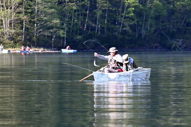 NPO法人北海道トラウトフィッシング協会(鹿追)の主催。コロナ禍の影響で初日にスタートできたのは19年以来3年ぶりで、初日は定員上限の50人が参加。解禁時間に一斉に手こぎボートなどで湖上に出て、思い思いの場所で当たりを待った。札幌から訪れた自営業、柳山仁志さん(23)は「ミヤベイワナが美しく、秋のニジマスも好き。然別湖の魚はみやびやか」と話し、友人と楽しんでいた。