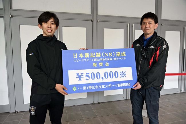 男子3000メートルで3分42秒82の日本記録を樹立し、市文化スポーツ振興財団から報奨金を受け取る一戸誠太郎(左)