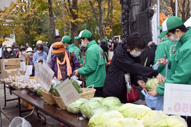 道立帯広美術館で開催中の「銀の匙展」を帯広農業高校の生徒が盛り上げ-。帯農生による野菜や加工食品の販売会「とかち農祭」が15日午前10時半、美術館前広場で始まり、“帯農産”の安くておいしい商品を大勢の市民らが買い求めた。16日も午前10時半から開催、売り切れ次第終了となる。
