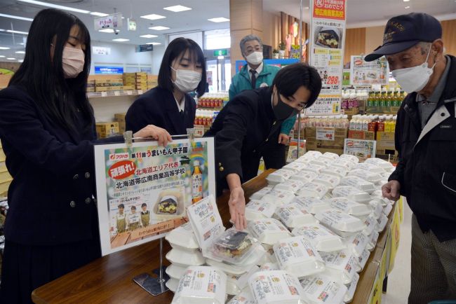 食品スーパー・福原(帯広市、福原郁治社長)の市内3店舗で5日限定で、27日に東京都内で開かれる「第11回ご当地!絶品うまいもん甲子園」決勝で帯広南商業高校クッキング部が勝負するメニュー「わやうめぇ蝦夷にぎ2」が販売された。生徒も売り場に立ちメニューをPRし、次々に売れていた。