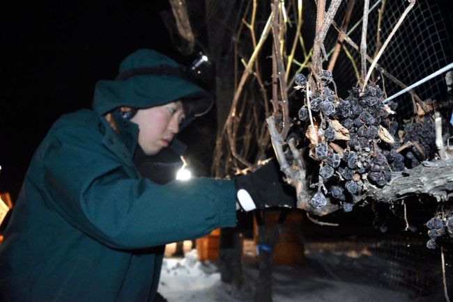 作業が始まった午前5時半ごろ、ほ場付近の気温は氷点下19度。町職員は日の出前の暗闇の中、ヘッドライトで照らして枝から葉を落とし、ブドウの実をかごに集めた。この日は約7800平方メートルのほ場で約1時間半作業し、アイスワイン用の収穫を全て終えた。