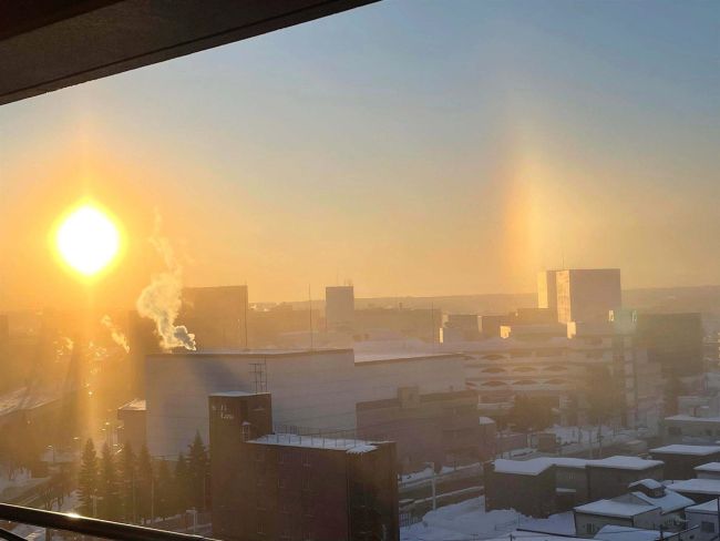 厳しい冷え込みにより、各地の河川で濃い川霧が発生。音更町内の十勝川では一帯が霧に覆われ、朝日に照らされた橋塔の影が雲上に伸びる幻想的な姿が見られた。また、帯広市街地でも、空気中の氷の粒によって太陽光が屈折する「幻日」が浮かんだ。