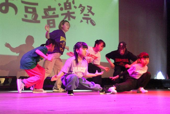 【本別】本別高校生が授業で考えたアイデアを発端とした町内初の音楽フェスティバル「お豆音楽祭」(実行委主催)が10日、本別町中央公民館で開かれた。プロのレゲエやヒップホップ歌手、ダンサーが出演したほか、管内外のアマチュアバンドやダンスチーム、フェスのために特別に編成された吹奏楽団体などもステージで躍動。道内外から来場した1100人を楽しませた。(北雅貴、若原奈緒通信員)