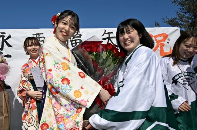 卒業生代表の佐々木雄望さん(共同獣医学課程6年)は答辞で、「仲間との思い出により、帯広で過ごした時間はかけがえのないものになった」と述べた。学業成績優秀者が表彰され、最後は学生歌「逍遙(しょうよう)歌」が演奏された。