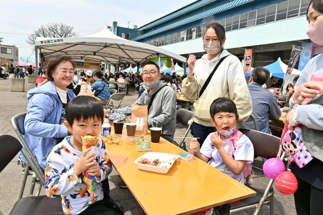 約370人が開場前に来場。場内には豚丼やポテトフライ、お好み焼きなどの出店やキッチンカー16店が並び、食欲をそそられる匂いが漂った。キッズコーナーのふわふわドームでは、元気な子どもたちの声が響いた。帯広市の会社員鳴海陽斗さん(20)は高校時代の友人と来場し、「とかち屋」のクレープを堪能。「親にも食べた方がいいと言われて来た。本当においしい」と笑顔を見せた。