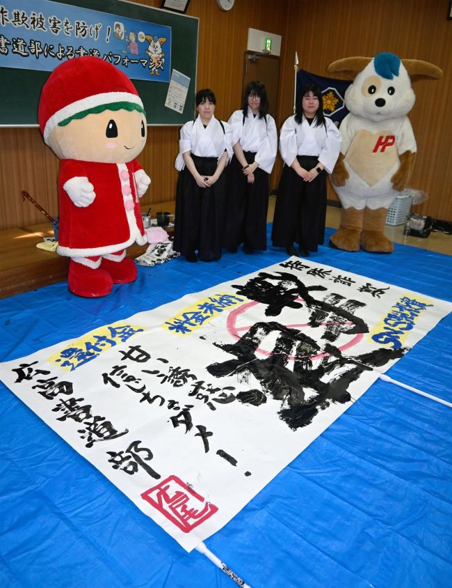 従来型の還付金詐欺のほか、最近はSNSを使った投資詐欺やロマンス詐欺が管内で頻発しており、幅広い層に注意を促そうと広尾署が企画。広尾高校の書道部に協力を依頼した。