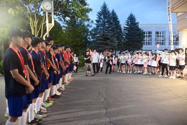 藤原悠楽主将が「この勝利は白樺高生全員でつかんだ勝利。感謝している。甲子園に行ってしっかり1勝できるよう練習していく。これからも野球部の応援をよろしくお願いします」とあいさつ。教員の割れるような大声の合図に合わせて万歳三唱した。