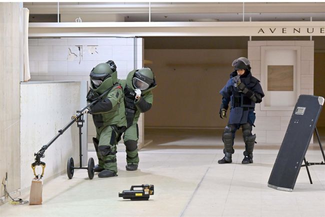 帯広署(工藤博光署長)と藤丸株式会社(村松一樹社長)などは22日、帯広市内の旧藤丸の建物を活用し、不審物の発見を想定した訓練を実施した。屋内で爆発物を見つけた際の対応について確認した。