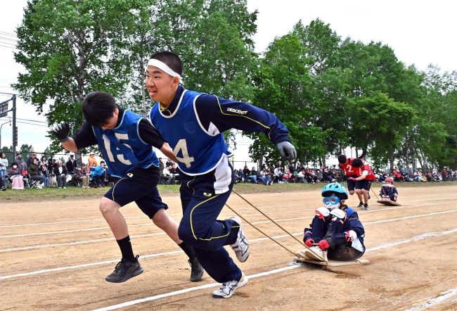 そりに乗った1人の生徒を2人で引いてリレーする「川西ばんば」では、途中でそりが壊れるアクシデントも。仕切り直しに「頑張れ」「いけー」と声援が飛び交った。最終種目の紅白リレーでは、全力で走りきった生徒同士がたたえ合う姿が見られた。(菊地青葉)
