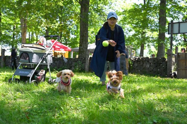 この日は快晴に恵まれ、参加者は爽やかな風が吹き抜ける木々の下で、愛犬と一緒に心地よいひとときを過ごした。犬用の雑貨販売店、ドッグオープンカフェも出店、保護犬・猫の譲渡会も開かれた。