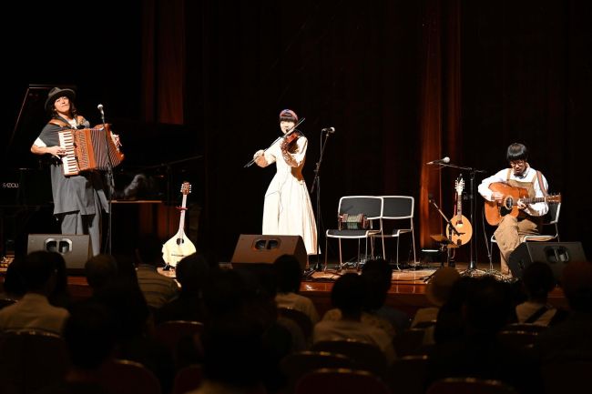【中札内】中札内村の中札内文化創造センターで7月26日、アイリッシュパブをイメージした音楽イベント「トリコロール 月と星めぐり音楽会」が開かれた。村内外から約100人の観客が集まり、クラフトビール片手に、3人組バンド「toricolor(トリコロール)」が奏でるアイルランド音楽を楽しんだ。