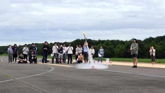 7日は町多目的航空公園の滑走路で、4グループに分かれて、火薬を使用するモデルロケットの打ち上げに挑戦した。ロケットが空高く打ち上がると、歓声も上がった。高度、射点から着陸地点までの距離、フェアリング(ロケットの先端部分)に詰めた生卵が無事かのミッションも競い、結果に一喜一憂した。
