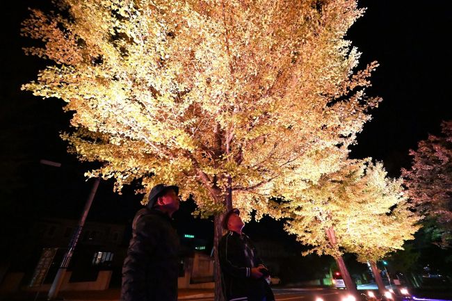 【音更】音更町木野西通13のむつみアメニティパーク(むつみ公園)沿いにあるイチョウ並木をライトアップする「音更いちょうまつり」(十勝毎日新聞社主催)が15日スタートし、訪れた人たちの目を楽しませている。24日午後9時まで。18日には関連イベントも行う。
