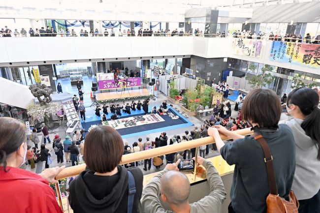 管内6校の高校生による書道パフォーマンスには、2階にも観客が詰め掛けた
