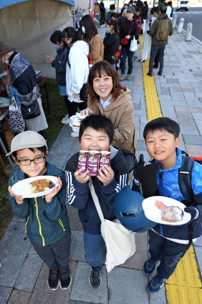 「こども食堂まつり2025」でカレーライスなどを受け取った子どもたち