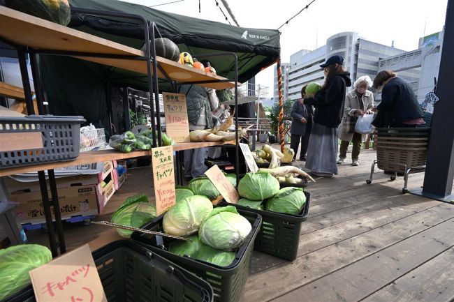 帯広市中心部の屋外商業ゾーン「藤丸パーク」で31日、「十勝大収穫市うまいもんまつり」が開幕した。旧藤丸百貨店時代の人気催事の復刻版。初日午前は高齢者や小さい子ども連れの家族らが訪れ、地域の特産品や飲食など十勝のグルメを楽しんでいた。