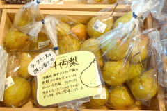 千両ナシは道の駅で、3個入り410円、2個入り300円で販売。道の駅内のカフェで、千両ナシを使用した生搾りフレッシュジュース(540円)も提供している。
