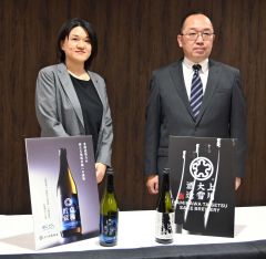 「純米吟醸 京極貯蔵」(左)と「特別純米 十勝」をPRする川端副社長