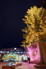 高さ15メートルのシンボルツリーを中心に植栽をLEDで飾ったほか、ロビーにはクリスマスツリーやフォトスポットも設けた。22日夕には早速、市民らがイルミネーションを背景に写真を撮影していた。