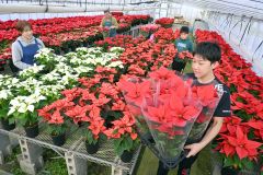 「聖夜」の花言葉でクリスマス時期に人気のポインセチアの出荷が、音更町の青木園芸(青木峰子代表)で最盛期を迎えている。ハウス内には濃淡さまざまな赤や白などの色鮮やかな鉢花が並び、家族総出で出荷作業に汗を流している。