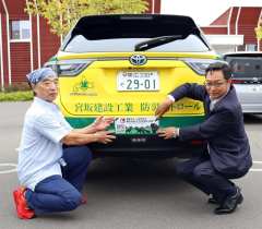 9月29日には、栗原さんが帯広市内の本社を訪れ、阿部副社長にステッカーを6枚手渡した。ステッカーは本社と札幌支社で所有する現場パトロールカーに貼り付ける。