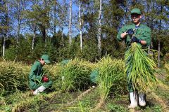 松田蒼大さん(16)は「手で刈り取るのは初めてで力仕事だった」と汗を拭った。担当の大和田愛教諭は「十勝でもコメ生産は広がると思う。本校でも陸稲の生産工程を確立できたら」と話していた。収穫した稲は2週間後に脱穀やもみすりを行う。