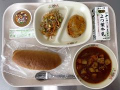 帯広市の献立は、帯広産小麦と十勝産ジャガイモを使った「ふすま(小麦の表皮)」入りの「十勝じゃがもちブランパン」や牛乳を含む6品。
