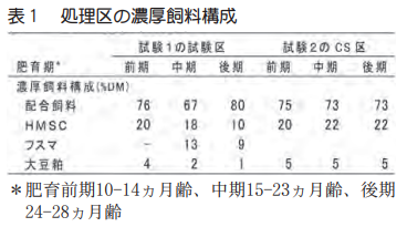 1)試験1:黒毛和種肥育において配合飼料、フスマおよび大豆粕に HMSC 混合給与(試験区)が飼料摂取量や発育、産肉成績に及ぼす影響を慣行の育成・肥育(対照区)と比較した。試験区の肥育期別の HMSC割合を肥育前期20%、中期18%、後期10% とし(表1)、濃厚飼料中のデンプン含量を肥育前期45.2%、中期43.2%、後期41.9% とした(表2)。