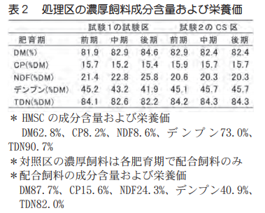 2)試験2:黒毛和種肥育においてトウモロコシサイレージを飽食給与とし、配合飼料および大豆粕にHMSC 混合給与(CS 区)が、飼料摂取量や発育、産肉成績に及ぼす影響を慣行の育成・肥育(対照区)と比較した。CS 区の肥育期別の HMSC 割合を肥育前期20%、中期22%、後期22%とし(表1)、濃厚飼料中のデンプン含量を肥育前期45.1%、中期45.7%、後期45.7% とした(表2)。