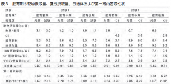 3)試験2:CS 区の乾物摂取量は対照区の乾物摂取量と大きな差はなく、日増体にも有意な差は認められなかった(表3)。出荷時体重は CS 区が783kg、対照区が770kg と有意な差は認められなかった。第一胃内容液では、pH については両区とも6.0を下回らず推移した。肥育中期・後期の CS 区の酢酸 / プロピオン酸比は対照区より高く、CS 多給による効果が確認された。