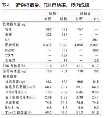 4)試験2:枝肉重量は対照区が505kg、CS 区が515kg と両区に有意な差は認めらなかった(表4)。胸最長筋面積、バラの厚さ、皮下脂肪の厚さおよび BMS No. についても処理区間に有意な差は認められなかった。肥育期間中に HMSC は乾物で605kg 給与可能であった。TDN 自給率は対照区の11.2% に対して CS 区は51.7%(CS 由来36.8%、HMSC 由来14.9%)となり、40ポイント向上が期待できる。
