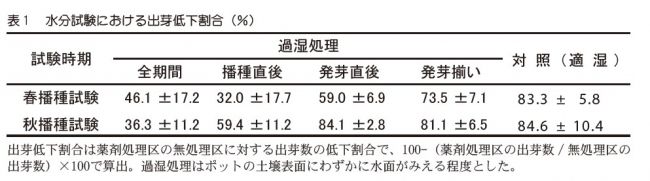 1)過湿処理によって対照区(適湿)を上回る出芽低下割合を示した区は認められず、薬害評価においては過湿処理が不要であることが示された(表1)。