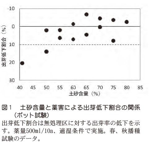 2)無処理区に対して薬害により10%以上の出芽率低下を示さない土砂含量は、播種床処理における農薬登録量の上限である500ml/10a では55%以上であった(図1)。