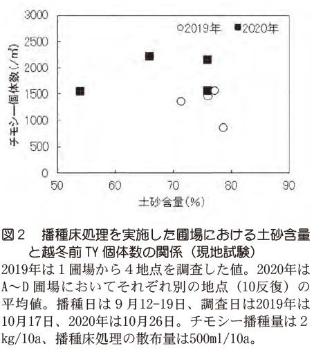 3)現地試験において、TY の越冬前個体数は1300−2200本/ ㎡であり、土砂含量54-76%の範囲では、土砂含量が越冬前TY 個体数に及ぼす影響は認められなかった(図2)。