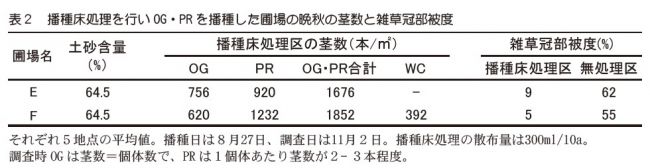 4)OG、PR を播種した現地2圃場(E、F)において、越冬前の雑草の冠部被度は播種床処理区では1割以下であったが、無処理区では6割程度となり、播種牧草は被圧された(表2)。播種床処理区では両圃場とも越冬前に十分な茎数が確保された。こちらに示すように300ml/10a でも防除効果は現れているため、散布量は「北海道防除ガイド」に記載されている200~300ml/10a を推奨する。