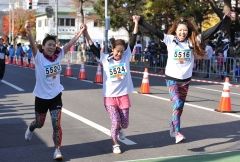 最後はつないだ手を上げて喜びのゴールを踏むランナー