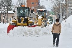 東2南10の中通りでは午前9時50分ごろ、1台の乗用車が雪で動けなくなっていた。地域住民5、6人が車体を押してもびくともせず、助けに駆け付けた重機も埋まる始末。最後は他の乗用車がロープでけん引して救出した。30分間にわたる奮闘劇に拍手が起こり、運転していた市内の会社員栗村英子さん(60)は「協力してくれた人に感謝。もう大きな道路しか通らない」と気を引き締めていた。